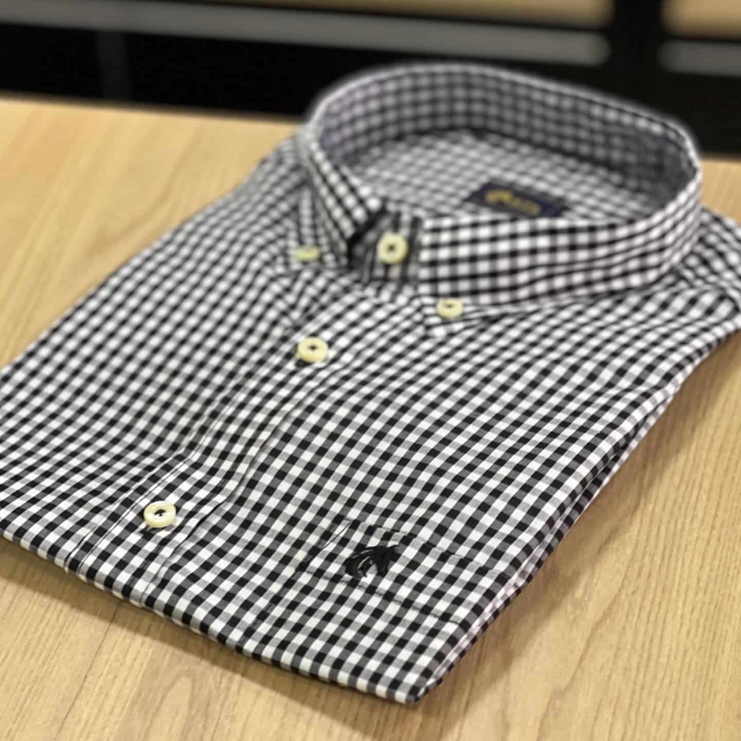 Camisa manga curta masculina xadrez preta e branco, 100% algodão, forma americana.