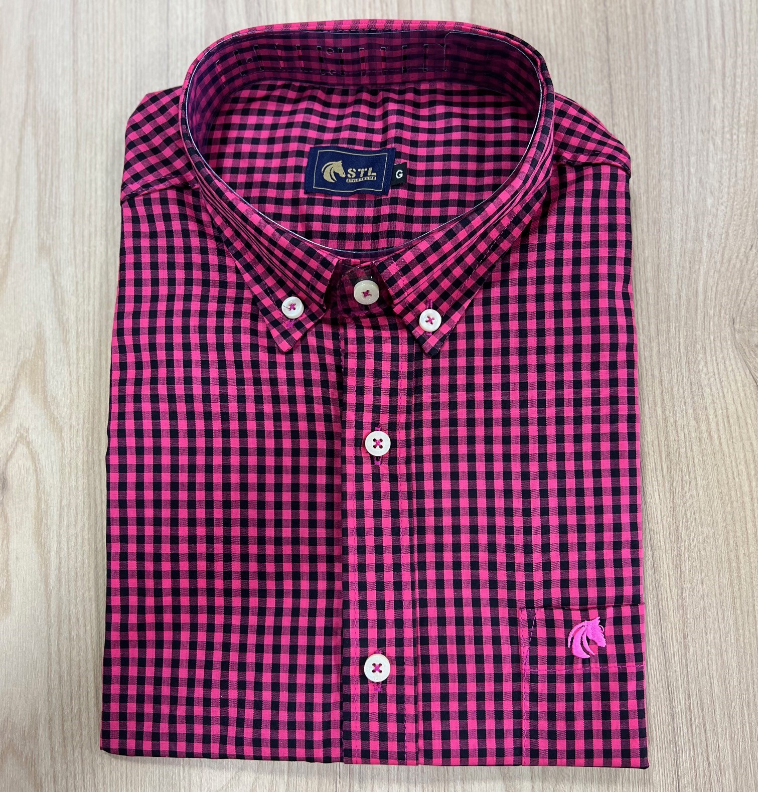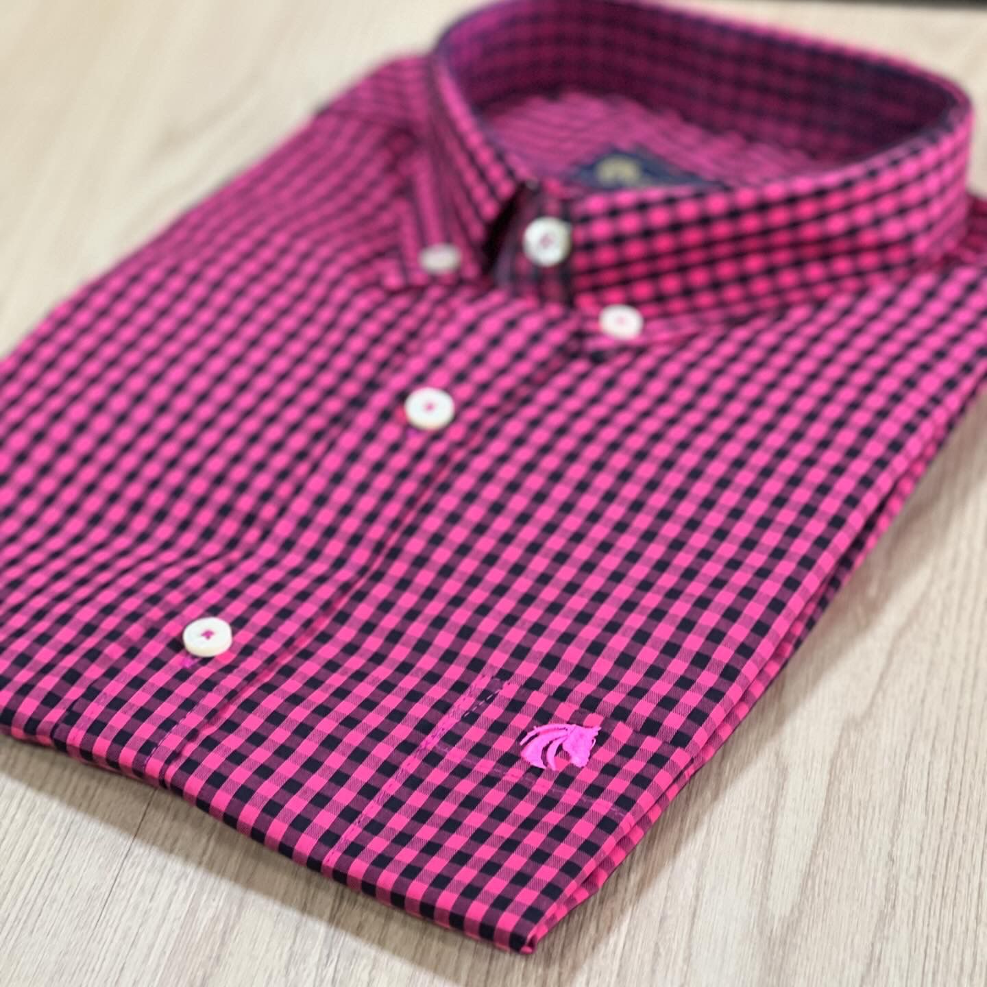 Camisa manga curta masculina xadrez vermelho, 100% algodão e forma americana.
